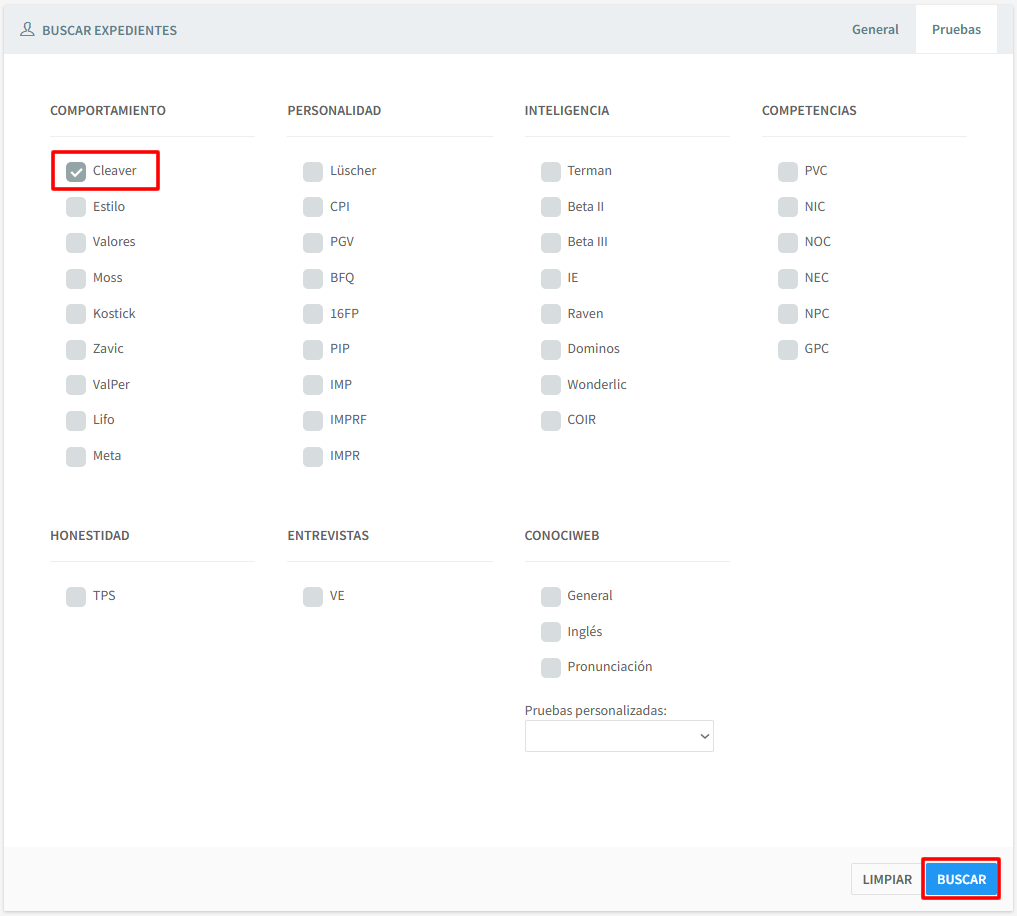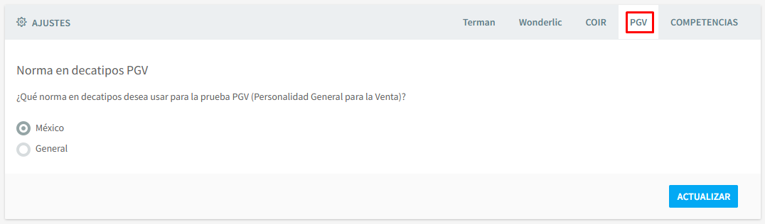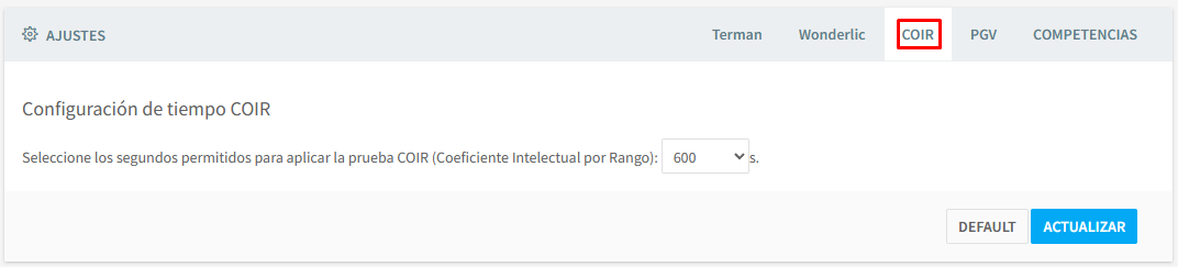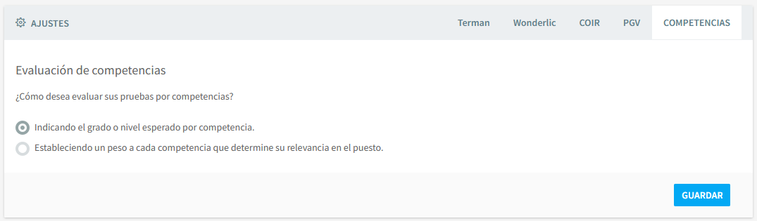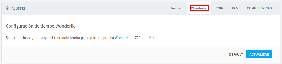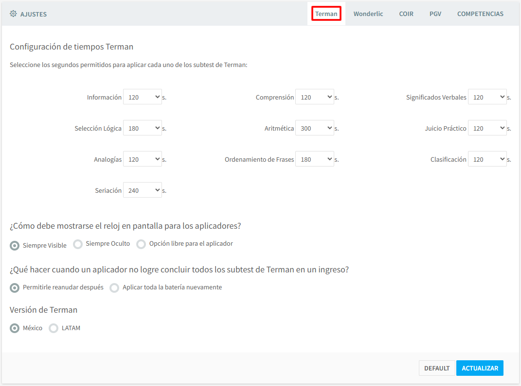 Podrá modificar los tiempos de cada test, si quiere que se muestre el reloj a los candidatos, así como el tipo de versión de la prueba que se le mostrará al candidato.