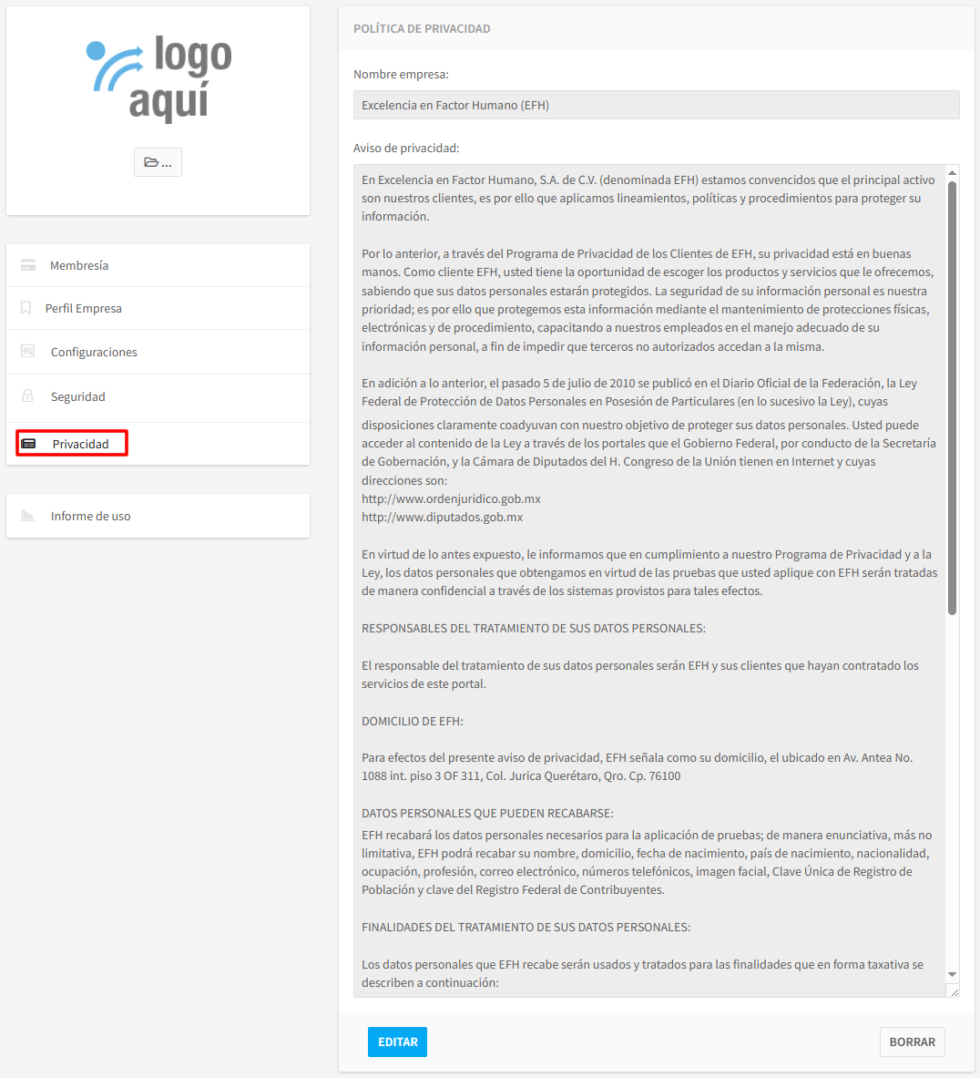 Dentro de este sub menú podrá ingresar su Aviso de privacidad para informar a sus candidatos, el cómo, para qué y qué datos personales recaba su empresa o institución, para garantizar transparencia y el control sobre su información. Esta información es Opcional.
