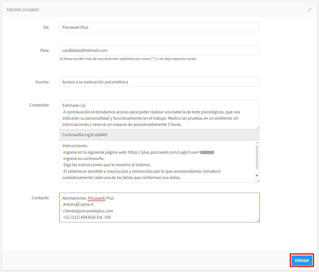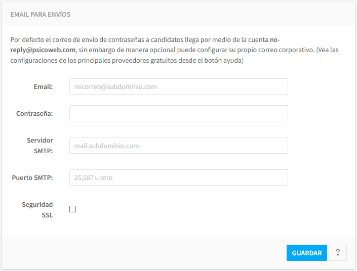 Por defecto el correo de envío de contraseñas a candidatos llega por medio de la cuenta no-reply@psicoweb.com, pero con esta opción, puede configurar su propio correo corporativo.