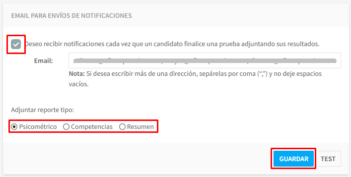 Podrá agregar uno o varios correos, para recibir la notificación cada vez que un candidato finalice una prueba adjuntando sus resultados, así como seleccionar el tipo de reporte que quiere que le llegue.