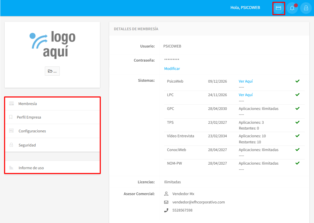 Para acceder a este apartado, deberá de colocarse en la parte superior derecha de la pantalla y dará clic en el icono de Membresía.