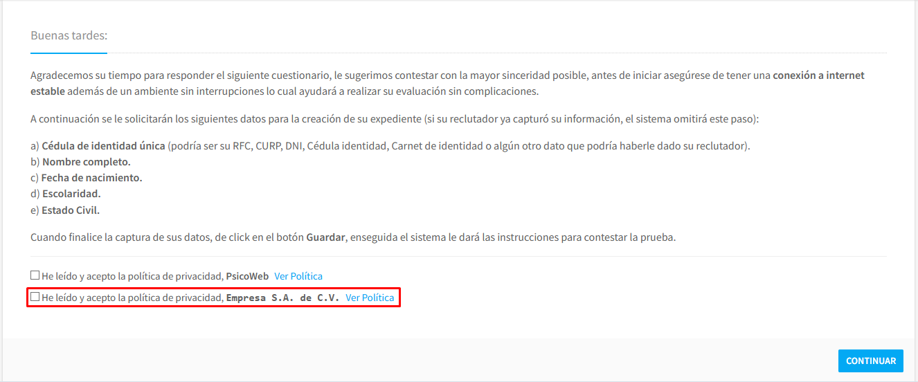 Nota: La política de empresa no sustituye a la de EFH, por lo que es necesario que el candidato acepte ambas políticas para poder continuar con su registro y aplicar las pruebas.