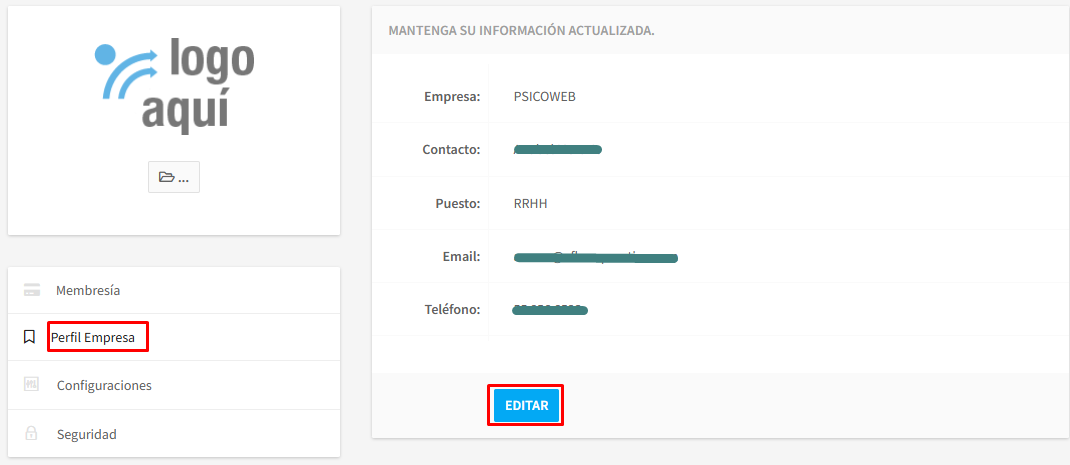 En esta sección podrá ver los Detalles de su Membresía, configurar su perfil de empresa, así como ajustar el nivel de seguridad de sus contraseñas, entre otras cosas.