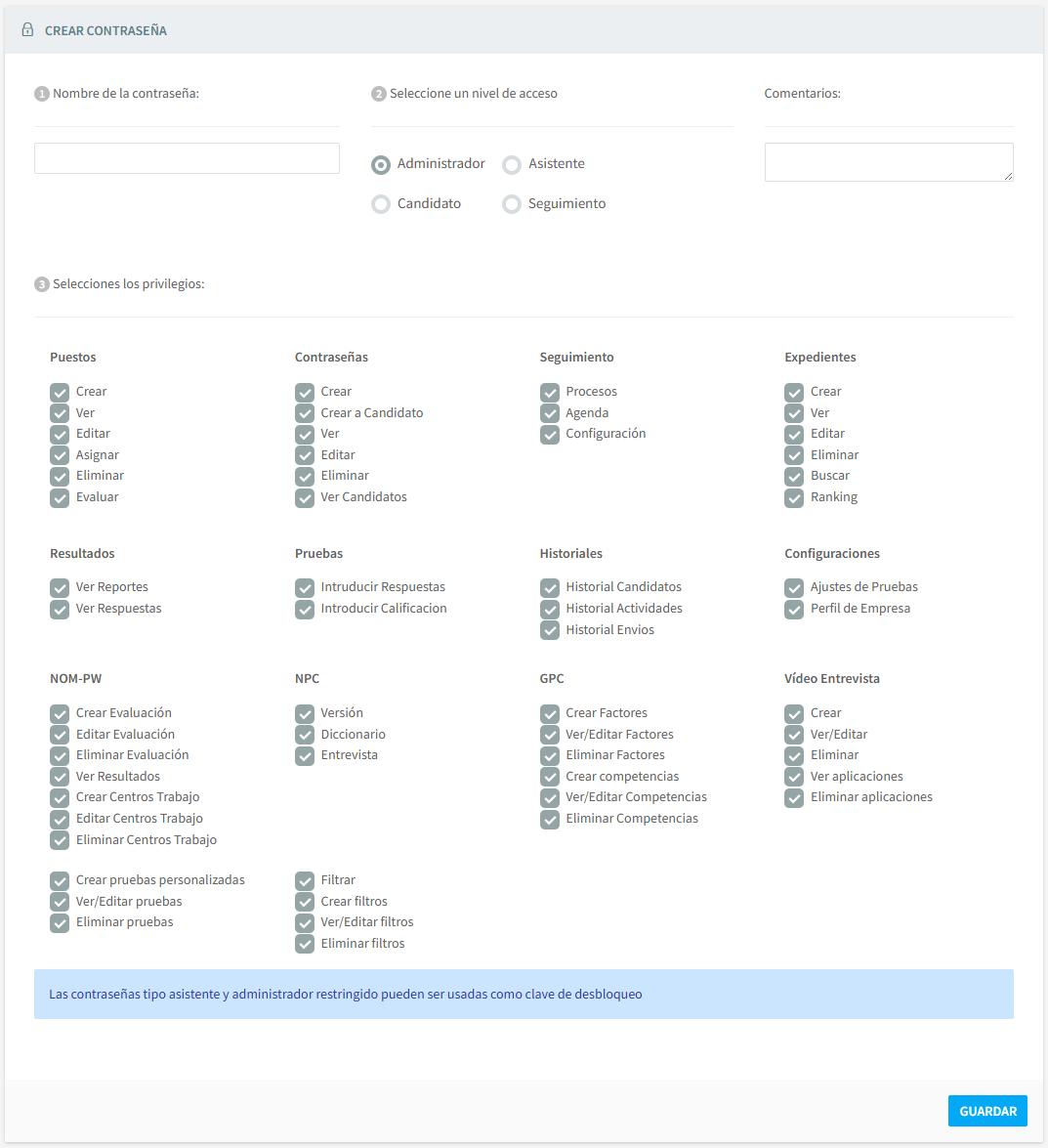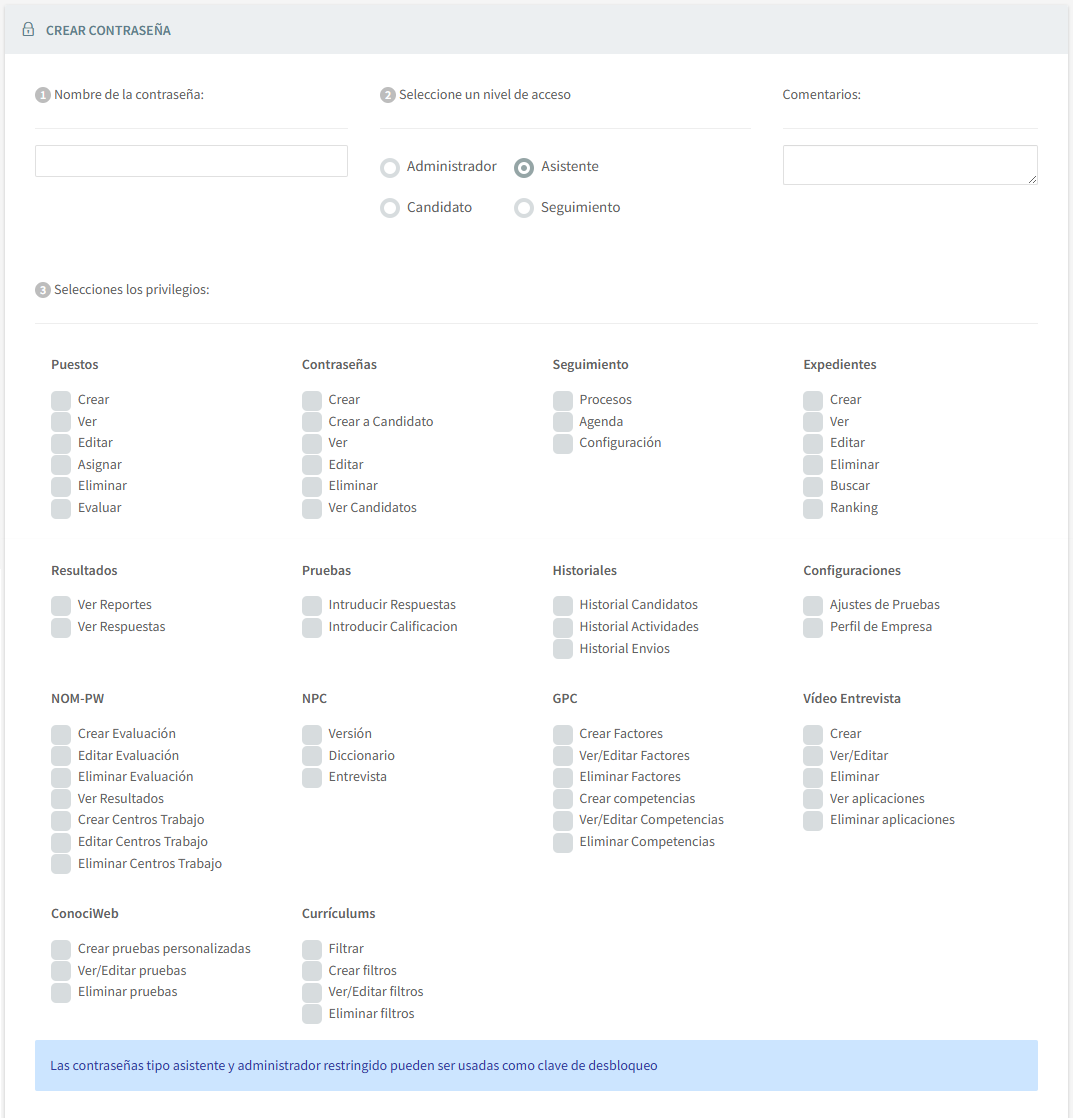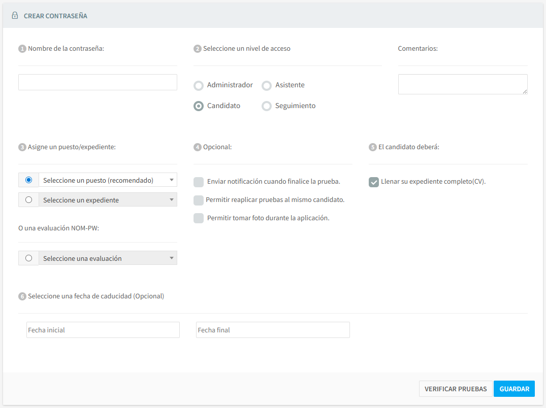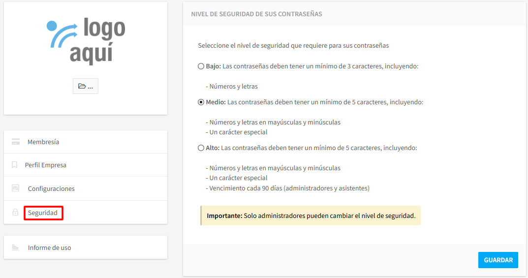 Aquí podrá seleccionar, un nivel de Seguridad para sus contraseñas, ya sea de Candidato o de Asistente y/o Administrador.