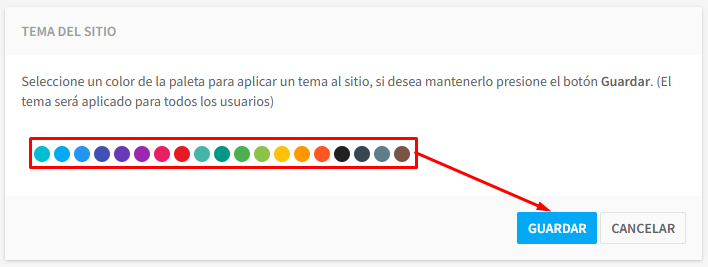 Podrá seleccionar un color, para aplicar el tema al sitio, mediante el botón de Guardar.