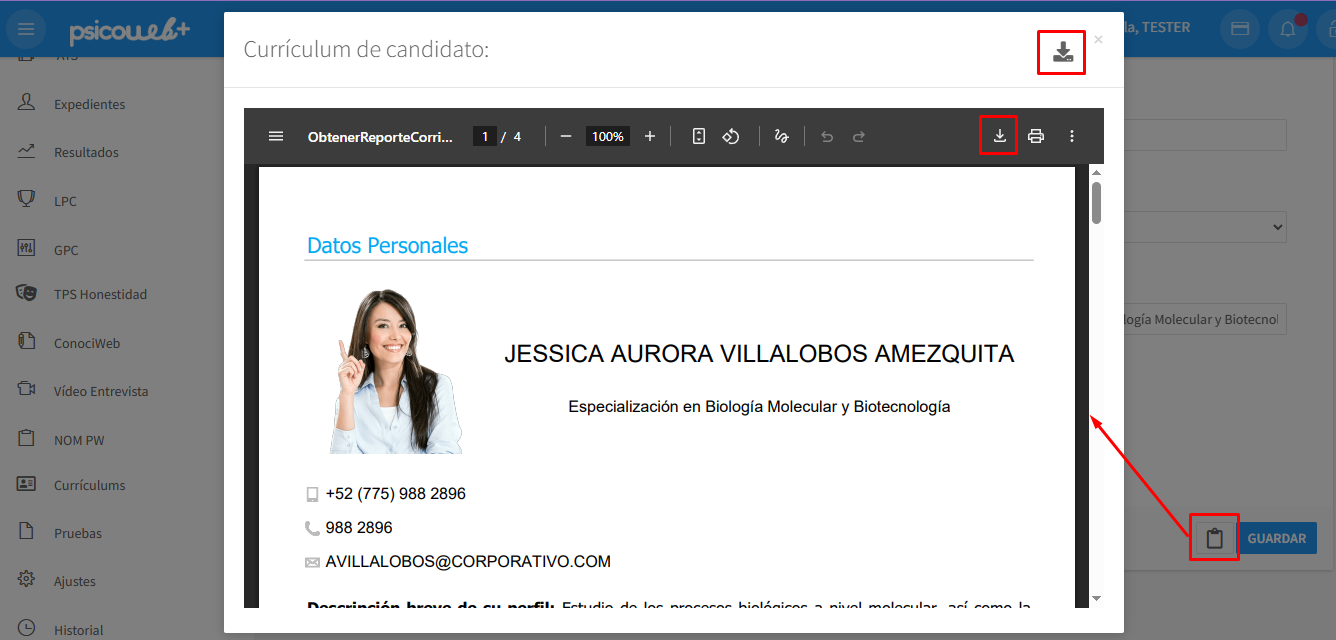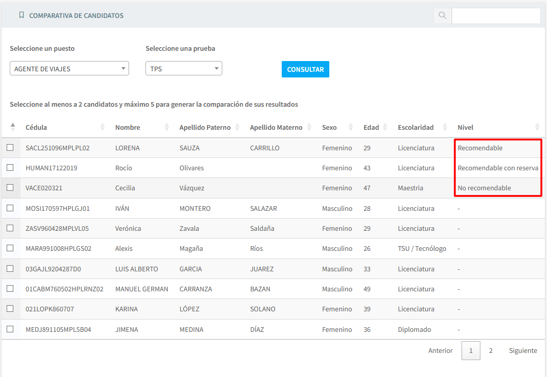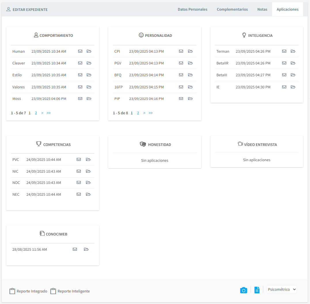PSICOWEB está concebido para cubrir satisfactoriamente las etapas uno y dos, mediante un riguroso almacenaje de Información, brindando de forma rápida y eficiente los Resultados e Informes que se requieren para una depuración inicial de los Candidatos.